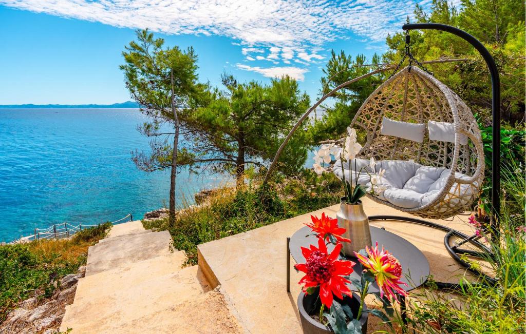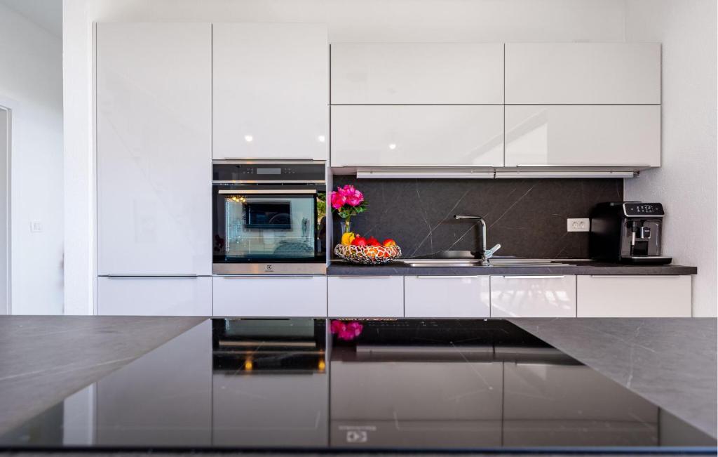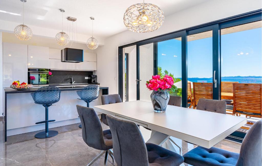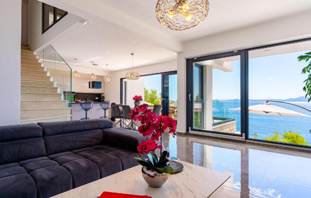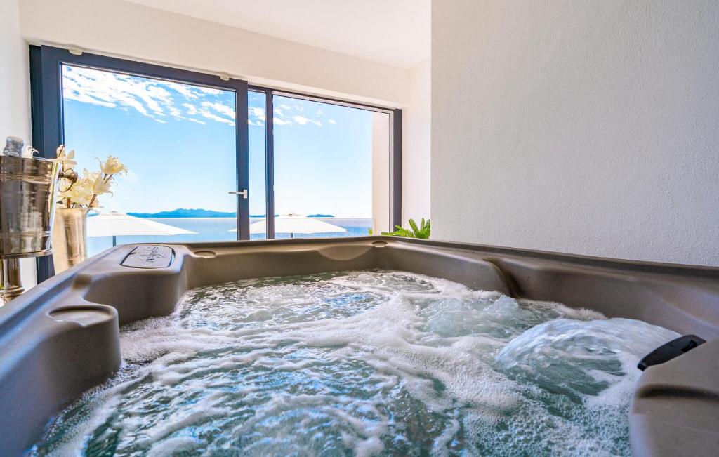 The luxuriously furnished Villa Grandiosa welcomes you to a privileged hillside location with a high-quality and tastefully decorated interior. Conjure up delicious dishes and enjoy them in the stylish dining area, where you can let your gaze wander over the glittering Adriatic Sea thanks to the floor-to-ceiling windows, and treat yourself to cosy moments in the whirlpool after a long day. Your elegant terrace is perfect for enjoying the long hours of sunshine under the open sky in complete privacy.